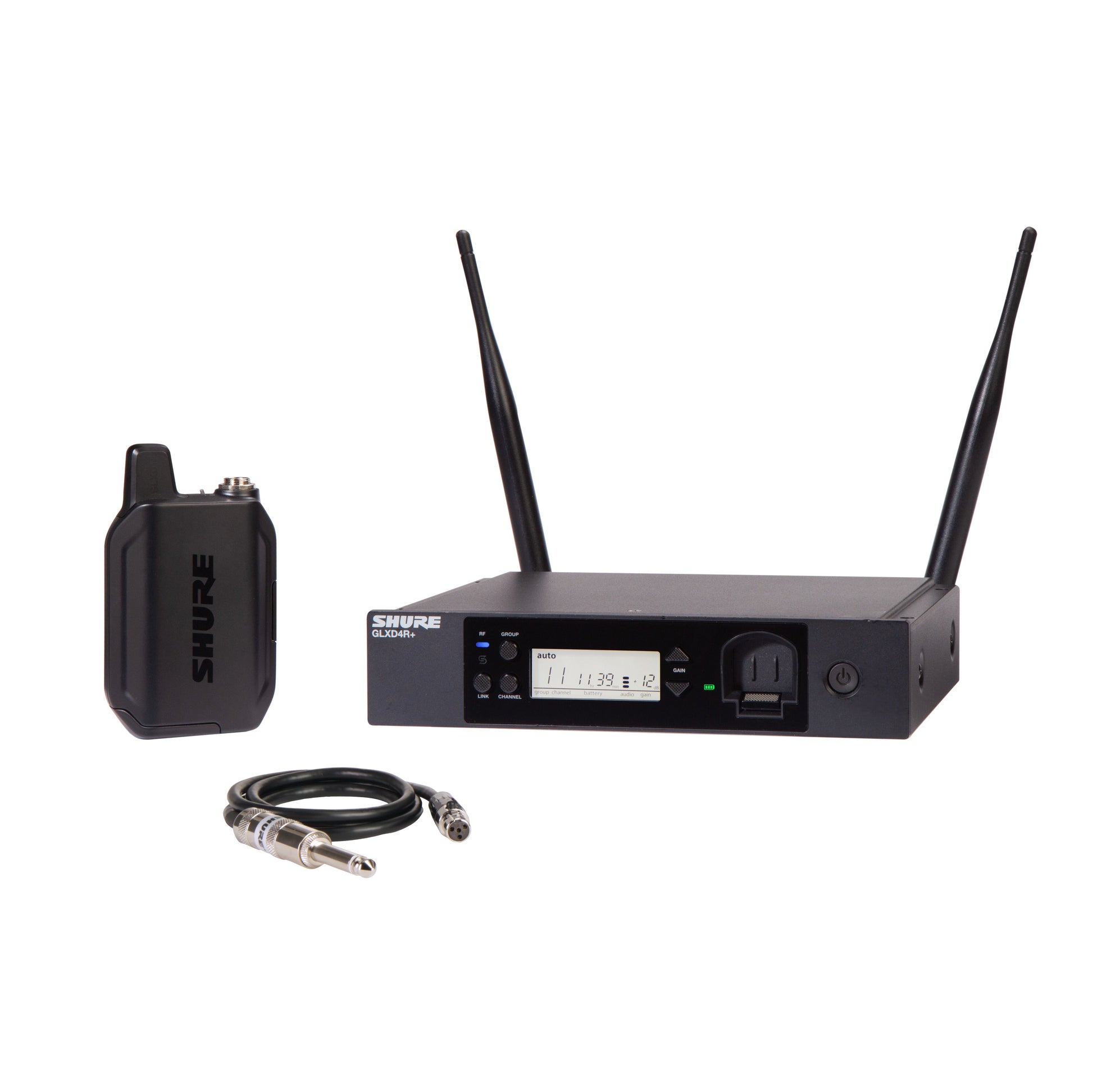 The new GLX-D+ Dual Band Wireless Rack System features the WA302 guitar cable and the GLXD4R+ half-rack receiver. The perfect combination of the automatic frequency management with the new Dual Band Technology provides reliable and consistent performance while Shure proprietary Lithium-Ion rechargeable batteries provide up to 12 hours of use. Go wireless without complications.